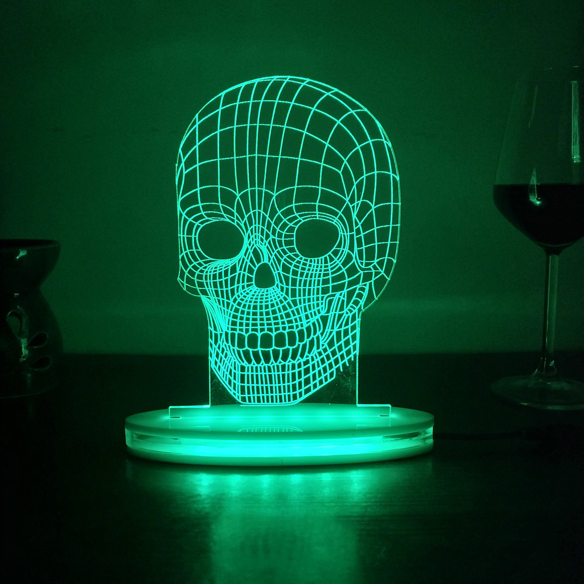 - Optical Illusion Design: The lamp features a special acrylic panel with laser engraving that creates the illusion of a 3D skull shape when illuminated. The skull appears to float in the air, giving off an ethereal and captivating effect.